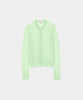 極めて細いモヘヤシルク糸を使用。コンパクトなシルエットのカーディガン。高度な技術により繊細に編まれたクラシックなケーブル柄の表情と透け感が特徴。